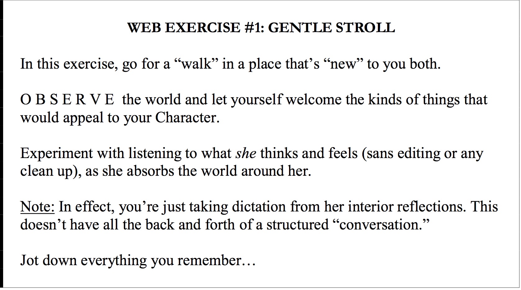 One of the early “DYC” exercises shows how important it is to start to observe your Character in her element, regardless of whether the bulk of the story as you imagine it requires much action there.